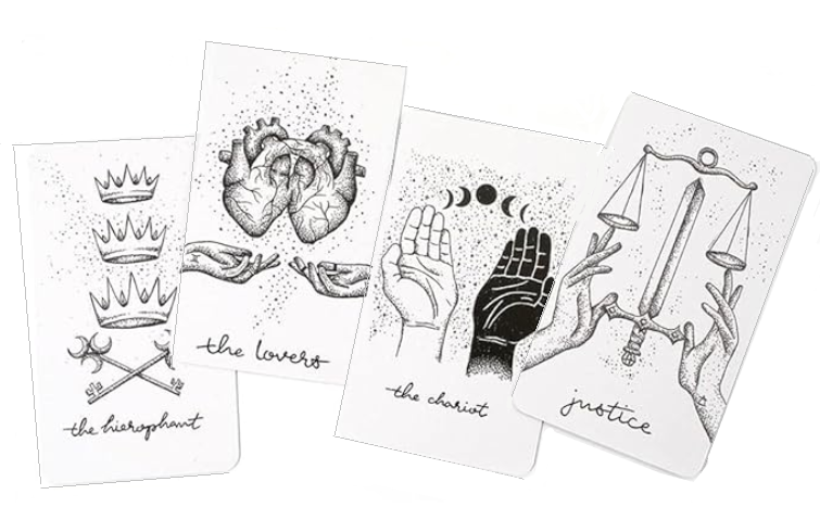 Le jeu de tarot est un jeu de tarot indépendant, avec des cartes toutes magnifiquement illustrées à la main en noir et blanc.