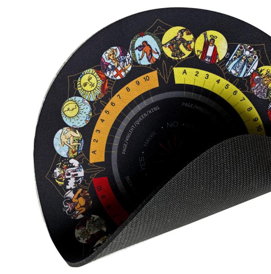Le tapis de divination et son pendule est l'un des outils de divination les plus utilisés et les plus anciens. Utiliser avec votre pendule, le tapis peut servir d'outil intégral pour les spiritualistes, l'utilisation de ce tapis aide à nettoyer les espaces, à équilibrer les énergies et à faciliter une guérison spirituelle profonde. Plusieurs niveaux d'informations sont inscrits sur le tapis: des chiffres, des cartes de tarot, des couleurs et des réponses telles que « Oui/Non », « Peut-être/Rephraser ».
