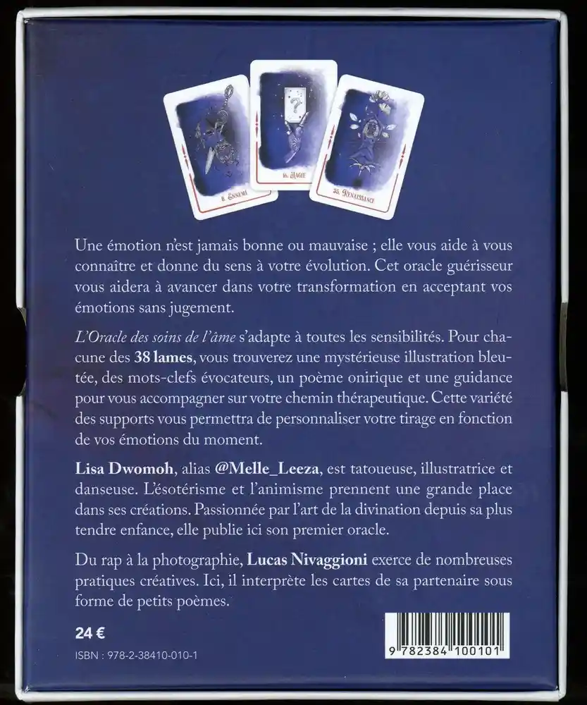 Lisa Dwomoh, alias @Melle Leeza, est tatoueuse, illustratrice et danseuse. L'ésotérisme et l'animisme prennent une grande place dans ses créations. Passionnée par l'art de la divination depuis sa plus tendre enfance, elle publie ici son premier oracle.
